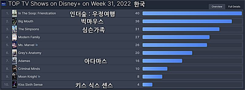 디즈니플러스 한국 2022년 31주차 TV 부문 TOP 10 ⓒOTT뉴스
