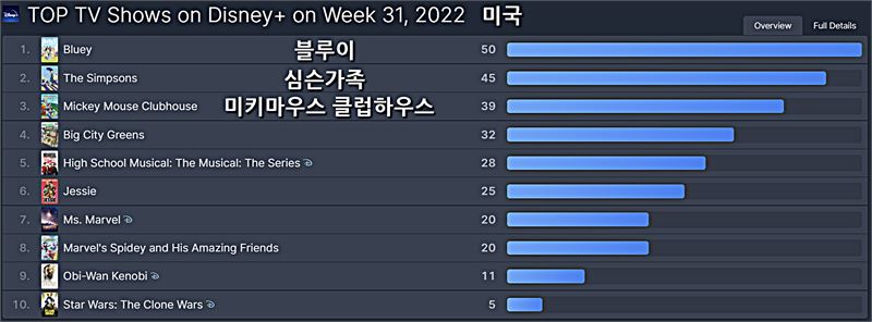 미국 디즈니플러스 TV부문에는 지난 주 1위였던 [블루이]가 5주 연속 1위를 차지했다. [심슨 가족]이 이번 주에도 지난 주에 이어 2위 자리를 지켰다.