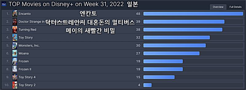 이번 주 일본 디즈니플러스 영화 부문 1위는 [엔칸토]가 차지했다. 지난 주 1위인 [닥터 스트레인지 대혼돈의 멀티버스]는 2위로 내려갔다.