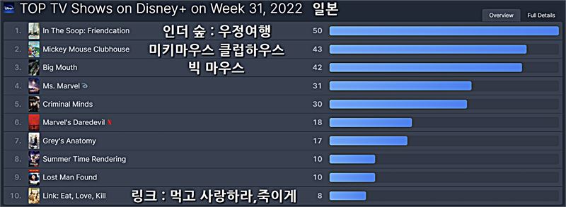 디즈니플러스 일본 2022년 31주차 TV 부문 TOP 10 ⓒOTT뉴스