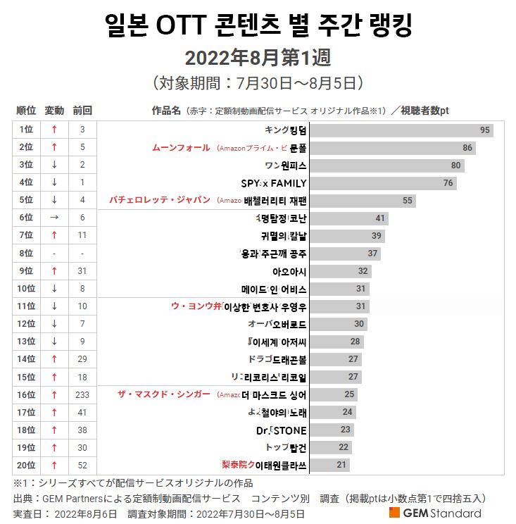 8월 1주차 일본 OTT 순위(사진=GEM Partners). ⓒOTT뉴스
