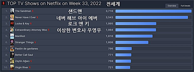 넷플릭스 전세계 2022년 33주차 TV 부문 TOP 10 ⓒOTT뉴스