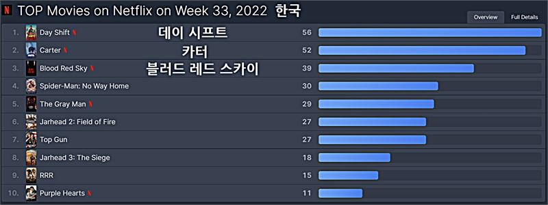 넷플릭스 한국 2022년 33주차 영화 부문 TOP 10 ⓒOTT뉴스