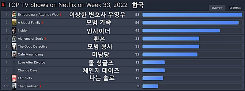 넷플릭스 한국 2022년 33주차 TV 부문 TOP 10 ⓒOTT뉴스
