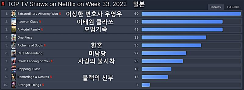 이번 주 일본 넷플릭스 TV 부문 순위 1등은 한국 드라마 [이상한 변호사 우영우]가 4주 연속 1위를 차지했다.