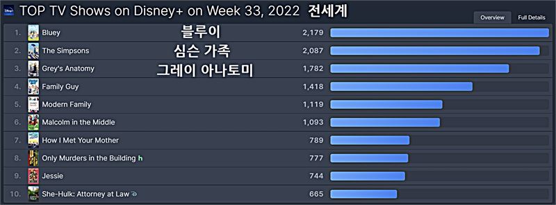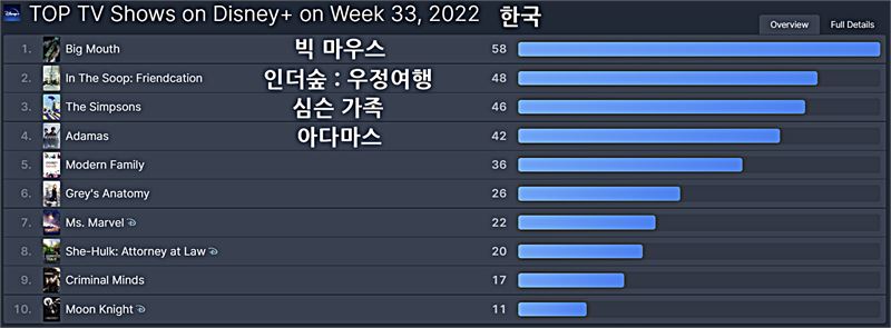 디즈니플러스 한국 2022년 33주차 TV 부문 TOP 10 ⓒOTT뉴스