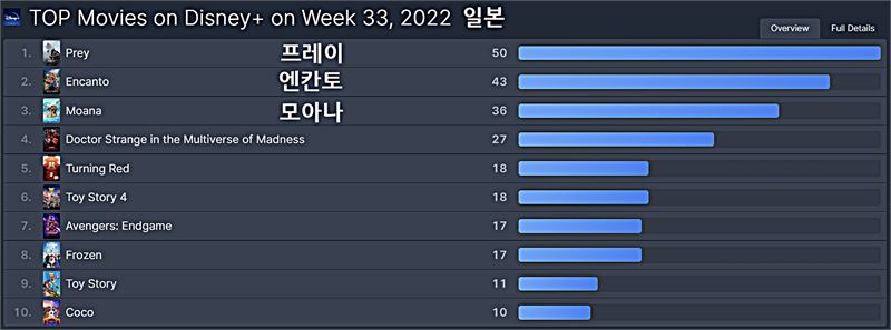 디즈니플러스 일본 2022년 33주차 영화 부문 TOP 10 ⓒOTT뉴스
