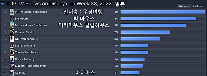 디즈니플러스 일본 2022년 33주차 TV 부문 TOP 10 ⓒOTT뉴스