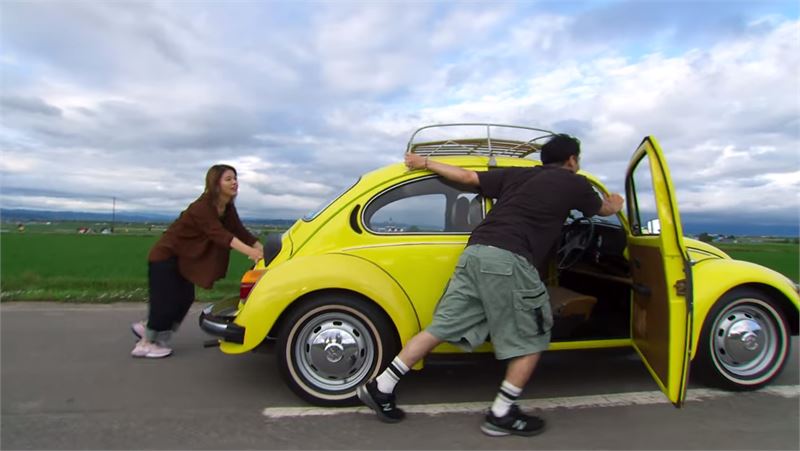 연료가 떨어져 차를 끄는 두 사람(사진=넷플릭스). ⓒOTT뉴스