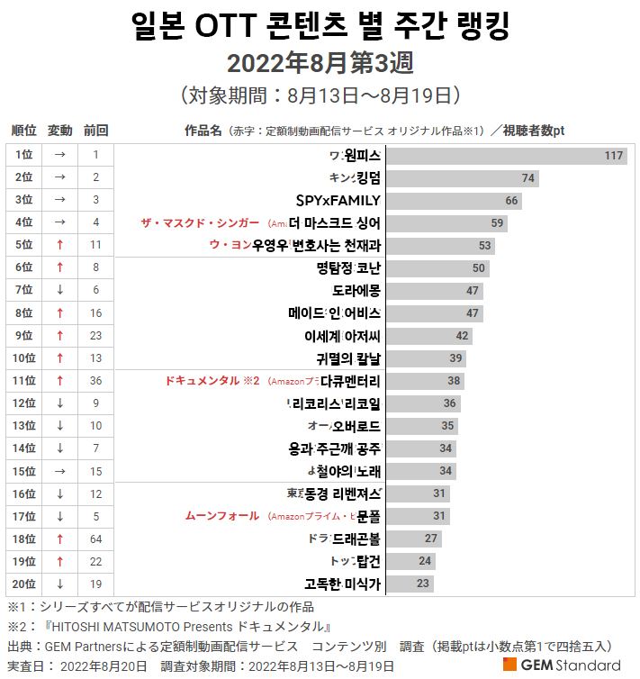 8월 3주차 일본 OTT 순위(사진=GEM Partners). ⓒOTT뉴스