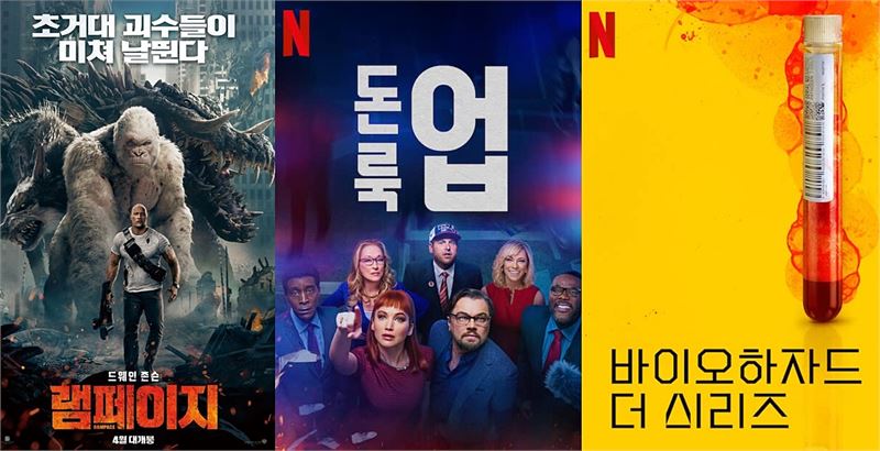 왼쪽부터 작품 '램페이지', '돈룩업', '바이오하자드'의 포스터 조합(사진=IMDb). ⓒOTT뉴스