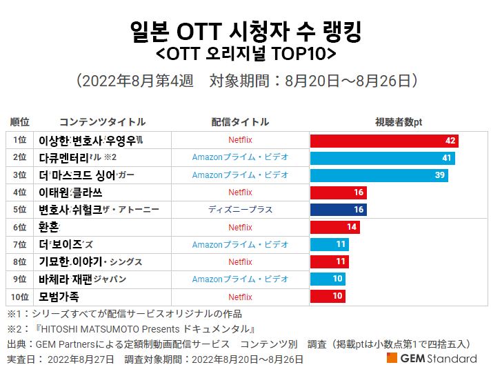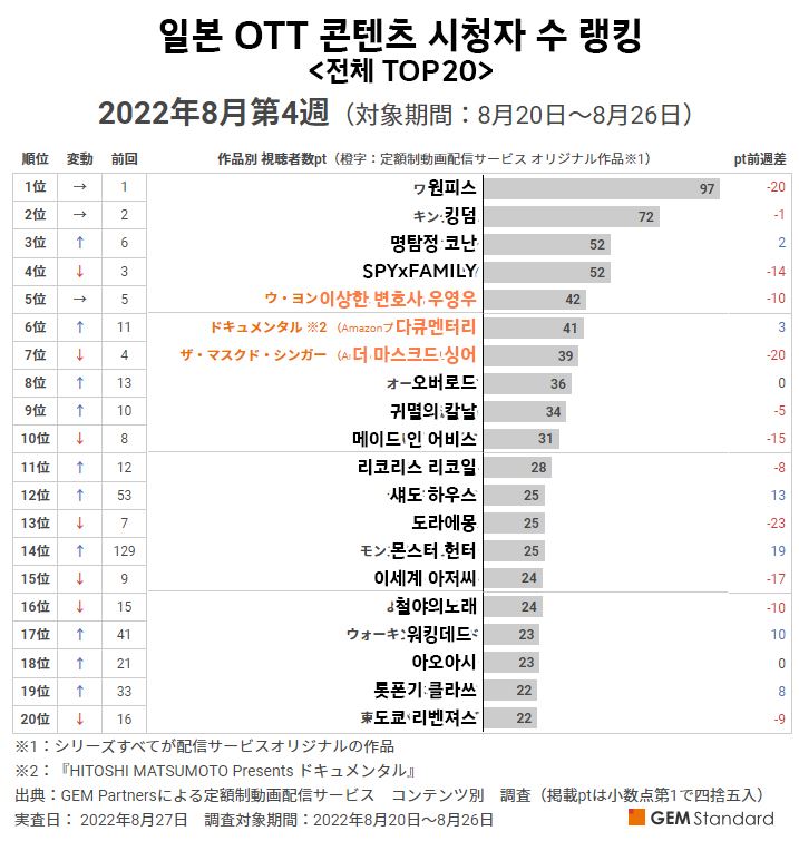 8월 4주차 일본 OTT 순위(사진=GEM Partners). ⓒOTT뉴스