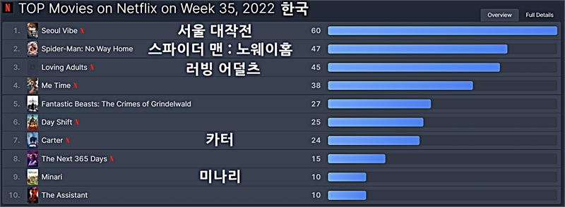 넷플릭스 한국 2022년 35주차 영화 부문 TOP 10 ⓒOTT뉴스