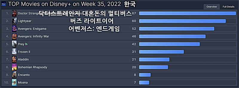 이번 주 한국 디즈니플러스 영화 부문 1위는 지난 주에 이어 [닥터스트레인지 대혼돈의 멀티버스]가 2주 연속 1위를 차지했다. 2위는 [버즈라이트이어]가, 3위는 [어벤저스 엔드게임]이 차지했다.