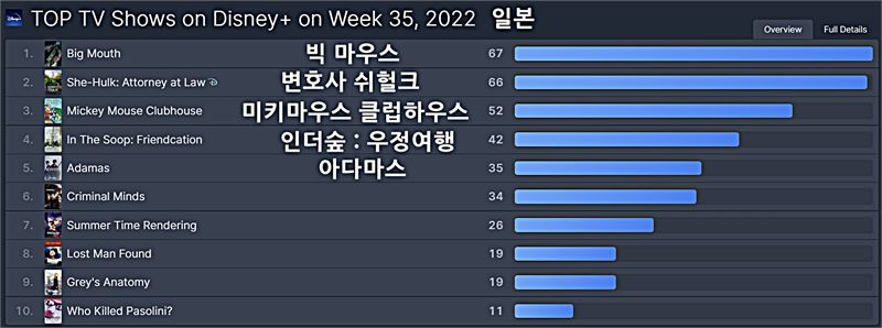디즈니플러스 일본 2022년 35주차 TV 부문 TOP 10 ⓒOTT뉴스