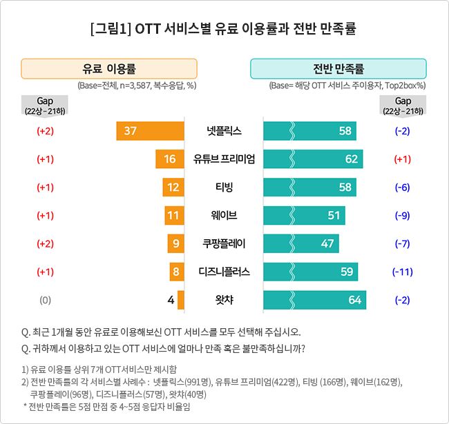 그 외 유튜브프리미엄(62%), 디즈니플러스(59%) 순이었으며 넷플릭스와 티빙은 58%, 웨이브는 51%였다. 쿠팡플레이는 47%로 이용자 절반도 만족시키지 못했다.