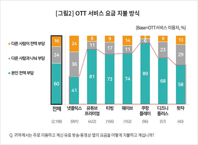 OTT 이용자 중 요금을 100% 자신이 부담한다는 응답은 평균 60%에 달했고 나머지는 40%는 다른 사람과 함께 부담하거나 다른 사람이 전부 부담한다고 답했다. 이용하는 서비스에 따른 요금 지불방식 비율에도 미묘한 차이가 나타났다.