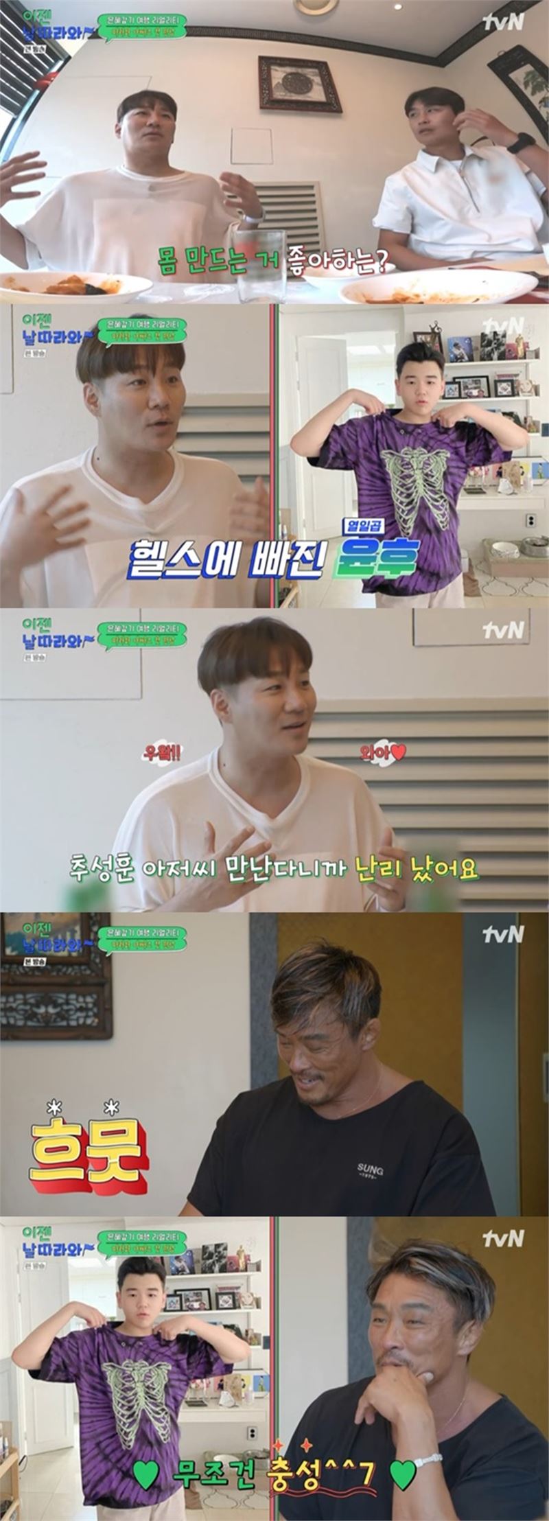 '이젠 날 따라와 첫방송에서 윤민수 아들 윤후는 추성훈의 건강미를 동경하는 면모를 보여준다(사진=티빙). ⓒOTT뉴스'