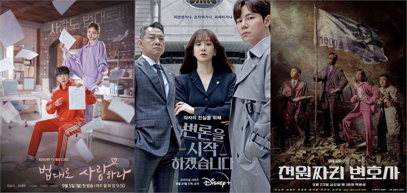 '법대로 사랑하라', '변론을 시작하겠습니다', '천원짜리 변호사'의 포스터(사진=KBS, 디즈니플러스, SBS). ⓒOTT뉴스