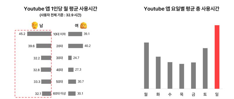 성별 및 요일별 유튜브 사용시간(사진=모바일인덱스). ⓒOTT뉴스