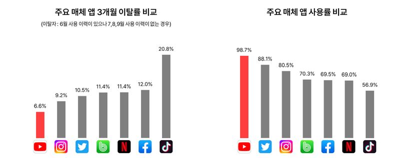 넷플릭스, 틱톡 등 타 동영상 플랫폼에 비해 유튜브의 이탈률은 최저, 사용률은 최고 수준으로 나타났다.