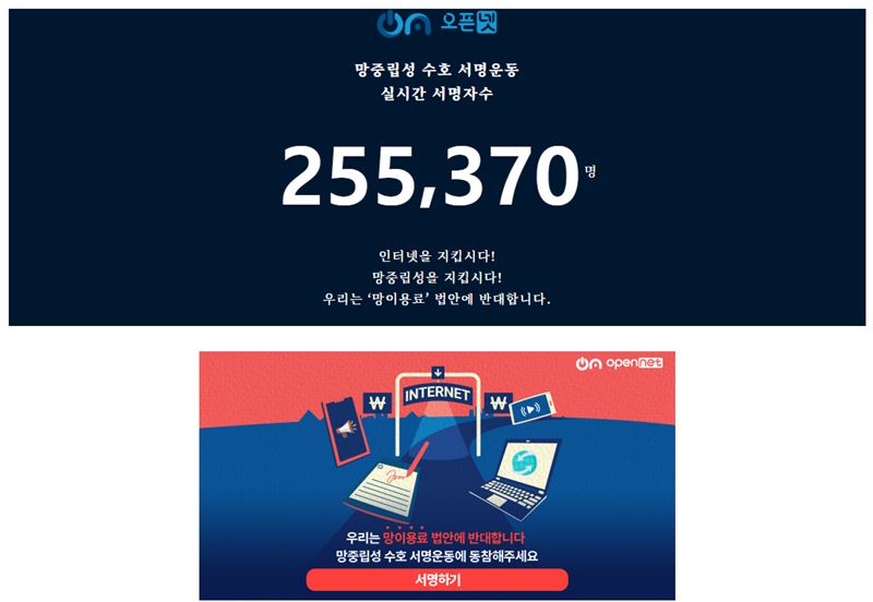 망 중립성을 지키기 위해 만들어진 (사)오픈넷에서는 망 사용료 법안에 반대하는 실시간 서명을 받고 있으며 17일 오후 1시 기준 25만 명이 넘는 이들이 망 사용료 법안에 대한 반대 의사를 표하고 있다.